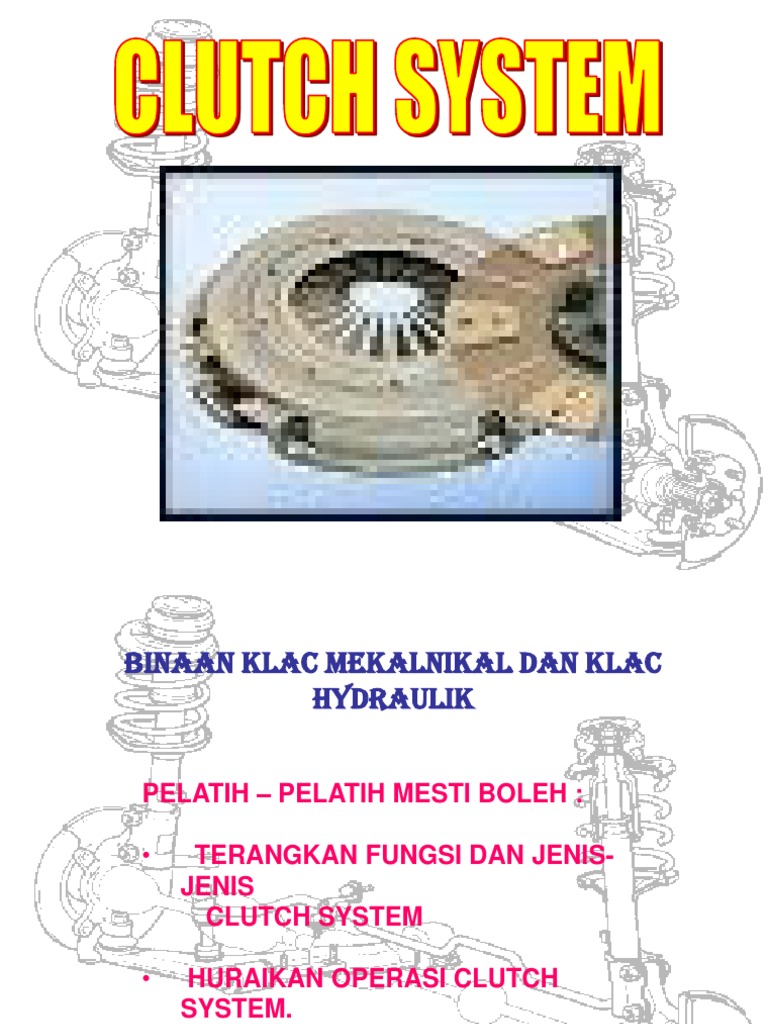 1972012 Pengenalan Sistem Clutch Klac digunakan untuk membenarkan pemandu menggandingkan dan menanggalkan gandingan enjin dan penghantarApabila klac dalam gandingan kuasa disalurkan terus dari enjin ke penghantaranJika penghantaran dalam cantuman gearkuasa enjin disalurkan terus ke roda kenderaan dengan roda boleh bergerakSecara amklac digunakan. Slipper clutch Fitur assist berfungsi saat motor akselerasi yaitu dengan membantu mengoptimalkan perpindahan tenaga dengan cara menghilangkan power loss pada kopling. Komponen magnetic clutch ini terdiri dari pressure plate pulley dan solenoid.